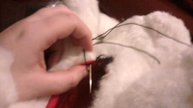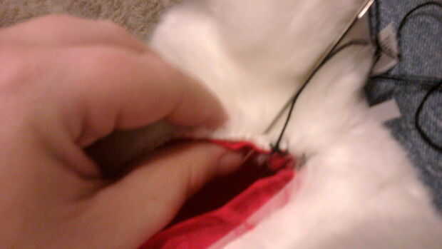 Con la aguja y el hilo, coser el forro de piel de conejo para mantenerlo seguro. He utilizado la puntada manta otra vez porque es fácil, grande y evidente – que quería obtener un tipo de apariencia de Frankenstein/patchwork. Cuando se cose todo el borde, final atando apagado el hilo de las primeras puntadas que hiciste.