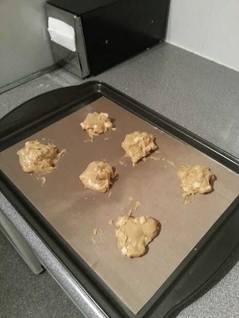 Haz una bandeja de horno grande y coloque una hoja de pergamino para hornear en ella, cuchara de la mezcla en la bandeja dejando un espacio suficiente entre las galletas para la expansión.