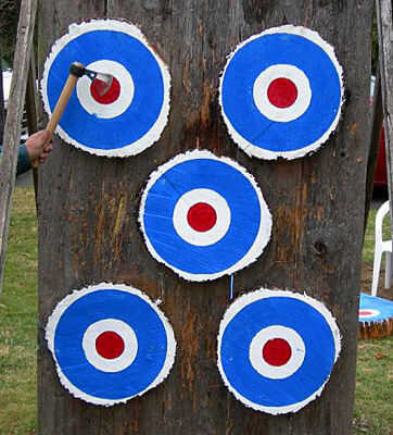 Cinco objetivos será montado perpendicular al lanzador, (por ejemplo, contra una pared o el respaldo), como los "cinco" en una pieza de domino o morir. La parte superior de los objetivos superiores izquierdos y derecho son 67 pulgadas de la tierra. El fondo de los objetivos inferiores izquierdos y derecho son de 18 pulgadas del suelo. Cada destino será un registro de alrededor de al menos 20"(50 cm) de diámetro, con un ojo de toros de 4 pulgadas de diámetro vale 5 puntos. Un 8 pulgadas de diámetro secundario anillo vale 4 puntos y un diámetro de 16 pulgadas fuera anillo vale 3 puntos. Una convención estándar para los colores es usar rojo, blanco y azul, como se muestra.
