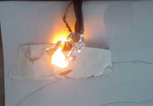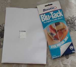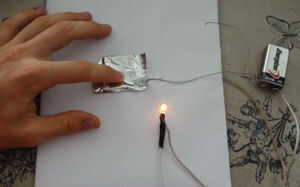 Usted tendrá que tomar una masa de tac azul y rollo en una salchicha, coloque este rollo alrededor del agujero cortado en la primera pieza de papel, este dejará las dos mitades del circuito de tocar juntos.