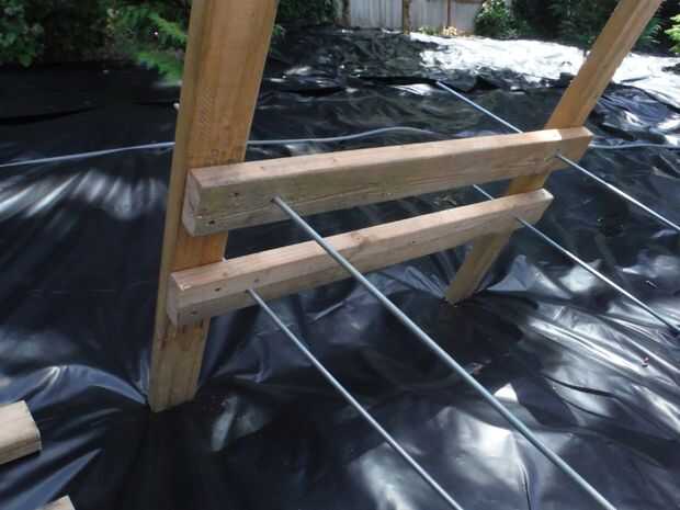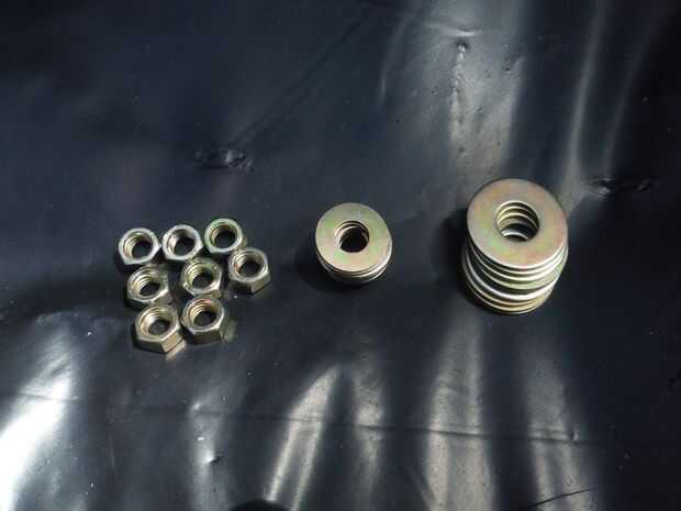 La base se apoye sobre su lado y poner las varillas roscadas en los agujeros. Luego, en la parte inferior de la base, poner primero una 1/2 Arandela, entonces una 3/8 arandela, luego una 3/8 tuerca en el extremo de cada varilla. Atornille la tuerca hasta que hay alrededor de una pulgada de varilla roscada que sobresale más allá de cada tuerca.
