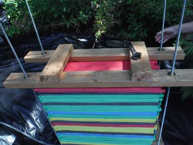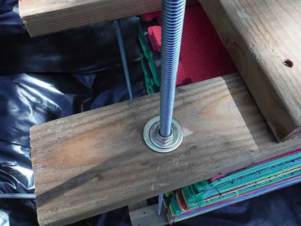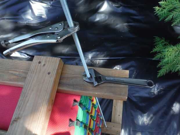 Ahora tienes que atornillar las tuercas sobre los vástagos roscados. No recomiendo cortar los pies de las varillas roscadas extra para hacer más fácil, porque realmente pueden atornillar cosas para arriba. Es muy difícil conseguir un corte limpio lo suficiente a través de la varilla roscada que no desordenar los hilos y hacer imposible la tuerca para ir, especialmente usando una amoladora. Si utiliza una sierra para metales, tardarás más en hacer los cortes que tendría que atornillar las tuercas de abajo. Una vez que has jodido las nueces todo el camino hacia abajo (tire para arriba en ellos una vez que crees que termines solo para estar seguro, podría levantar otra pulgada o dos), use un rotulador para marcar para mostrar cuánto hacia abajo de las tuercas están en las varillas roscadas. Ahora, toma las pinzas de bloqueo y bloquearlos a la varilla roscada para impedir el giro, como se ve en la tercera imagen. Utilice su llave para apretar las tuercas en cada barra, haciendo un poco de cada varilla, a continuación, pasar a la siguiente, hasta que se ha comprimido la espuma abajo varias pulgadas, que se pueden ver observando las marcas en las varillas roscadas. Quieres comprimirlo suficiente para impedir que mueve a todos, pero no lo suficiente que es difícil quitar las flechas. Que tenga que tirar unas flechas en él y ajustar las tuercas en consecuencia.