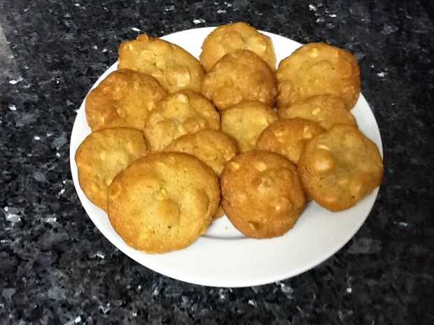 Agregue las nueces de macadamia y virutas de chocolate blanco.