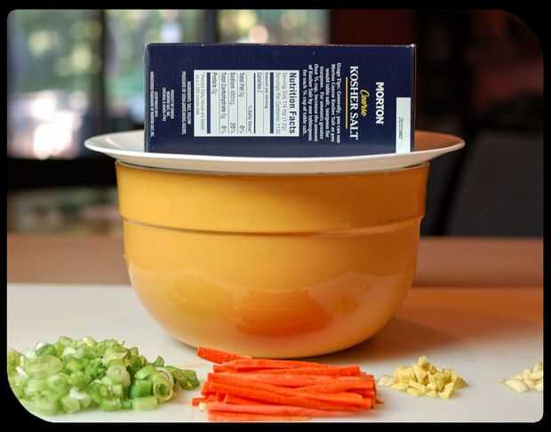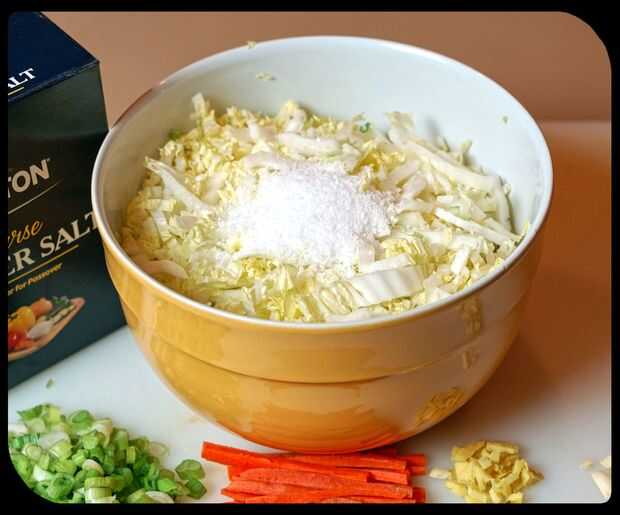 Coloque 2 cucharadas sal y col en un tazón y mezcle. Cubra el tazón con una placa y una toalla para dos horas.