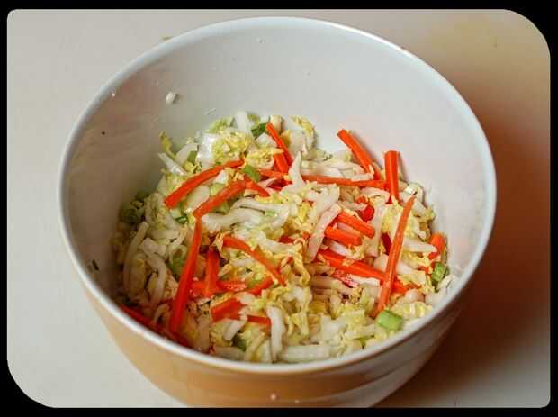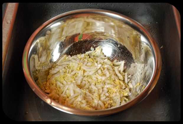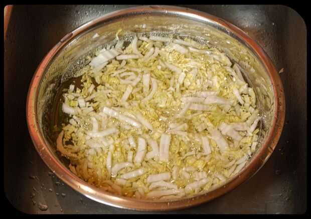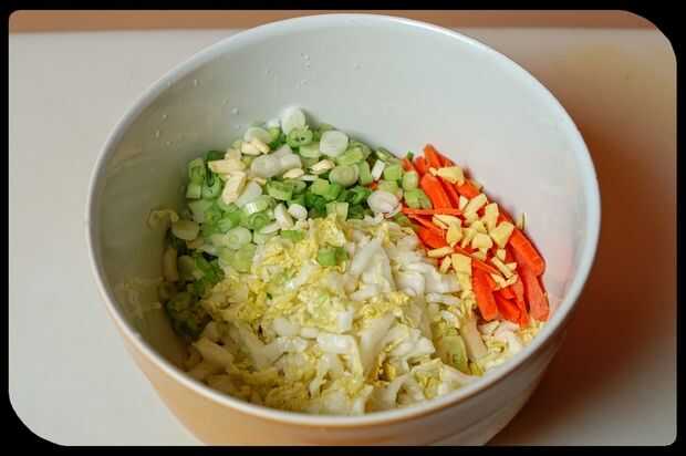 Enjuagar, exprimir y volver a lavar la col con agua fría. Exprima el exceso de agua restantes y poner en un tazón grande. Mezclar las zanahorias, cebolla de verdeo, ajo, jengibre, 1 cucharadita de sal y azúcar. Revolver bien.