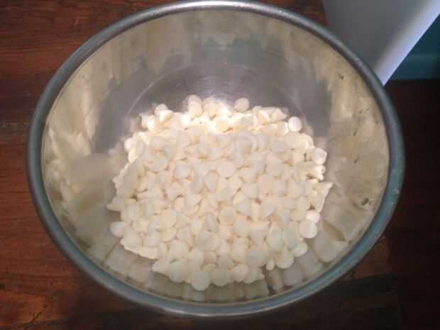 Vierta sus chips de chocolate blanco en la parte superior del baño María. Utilice un recipiente de metal y luego tenerlo sentado en una olla en agua hirviendo sin tocar el agua. Revuelva el chocolate constantemente: quiere fundir el chocolate poco a poco sin tener quemar o se separa.