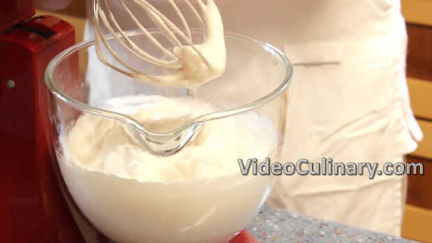 8 huevos separados. Coloque las claras de huevo en el cuenco de una batidora. Añadir una pizca de sal y batir a velocidad media hasta que estén espumosos. Aumentar la velocidad y gradualmente añadir 100 gramos de azúcar. Batir hasta que esté espesa.