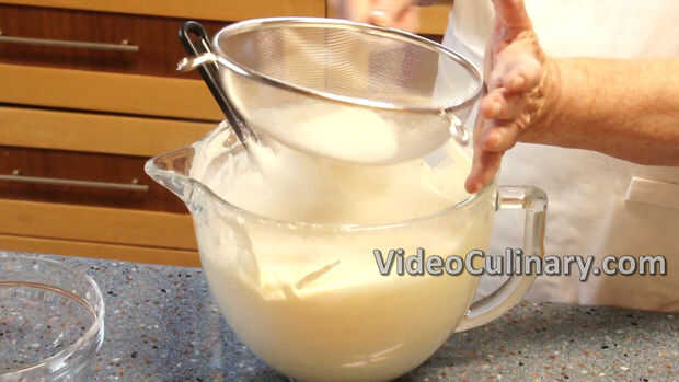 Tamizar 200 g (7 oz) de harina sobre los huevos batidos y doblar suavemente hasta que se combinan.