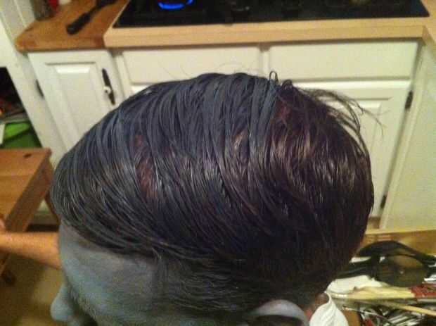 Para la cabeza, humedezca un pelo peine y estilo a su época. Con una esponja aplicar pintura al cabello en un movimiento de barrido, siguiendo la dirección que el pelo ha sido estilo. Para áreas donde hay una parte o la piel está expuesta y pelo corto, utilice el mismo movimiento punteado con una esponja de antes.