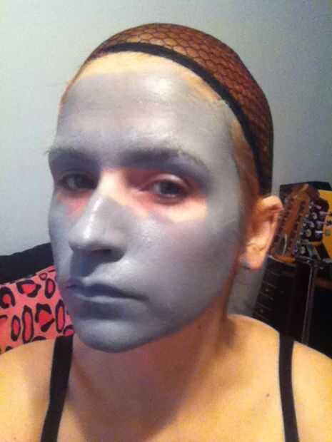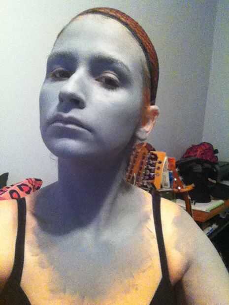 Blush: mezclar la gota más pequeña de negro en su tono de base. Aplicar en forma de marca de verificación, un toque en las manzanas y una línea hasta el hueco de la mejilla, termina en los oídos. Una vez que se ha aplicado la mayor parte del pigmento en la esponja, plumas hacia fuera de sus bordes por punteado el pigmento. Si tienes problemas para su línea de fusión, mojar la esponja en un poco de tu base pigmento y mezclarlo con los bordes rubor todavía húmedo.