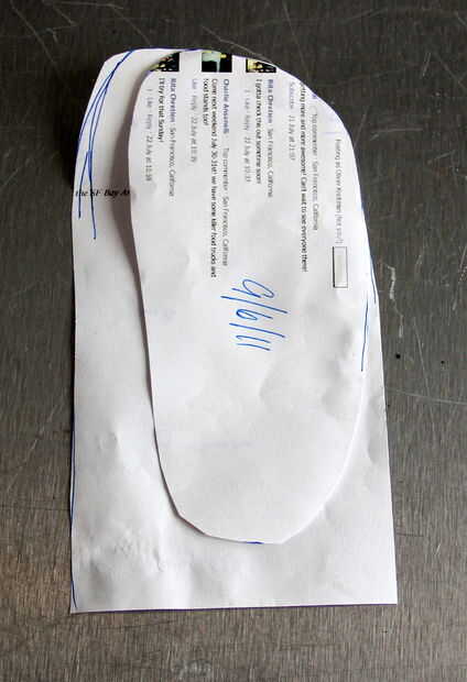A continuación, dibujar la parte superior del zapato. Otra vez, es diferente de los botines - debe ser significativamente mayor para la altura creciente del arco de su hijo. Además, la suela hace el zapato más rígido, por lo que tienes que construir en más espacio que si estuviera poniendo botines en el mismo par de pies. Revisa la segunda foto abajo - parece más fácil para que coincida con el lado derecho de la zapatilla y añadir unos 2/3" en el lado izquierdo. Pecar de demasiado espacio Usted puede siempre hacer más pequeño. Continuar con la parte superior aproximadamente 1/2" más allá del final de la pauta única.