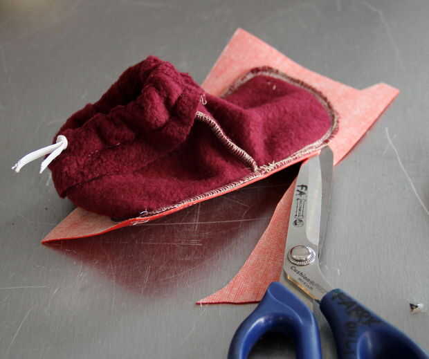 Primero probé dejando un amplio margen y plegable hacia arriba y sobre borde de botín, pero no funcionaba. El borde más grueso atrapado ya Corvidae caminando y ella raspa sus pies, llevando a través de cualquier sujetadores (hilo de tapicería, etc.) había usado para coser el borde hacia abajo. Rápidamente dejó caer abierta, y tuve que hacer un recorte de emergencia. Es más rápido y más fácil (no mencionar el más eficaz) para recortar justo al borde de la bota.