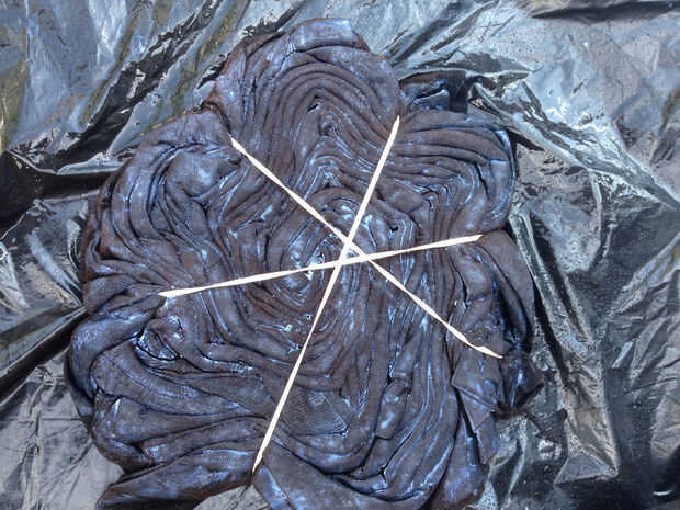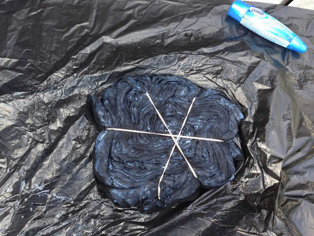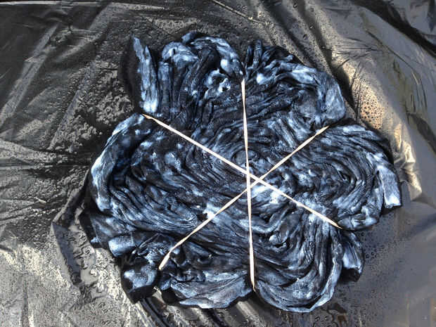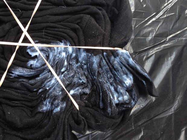 I aplicar la crema de la lejía de manera uniforme sobre las superficies frontales y posterior de la camiseta, spritzed con agua a remojar y volcó el plástico masajear el blanqueador en la camiseta.