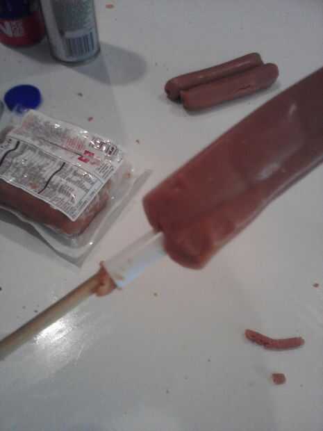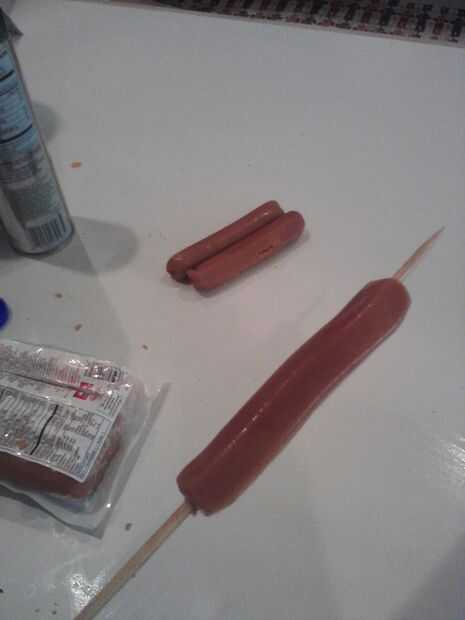 Luego tomar el pincho y perforar a través el perro caliente (como un perro del maíz). Luego tomar la paja y con la brocheta como guía, pasar a través de la longitud del perro caliente para ahuecar. Esto creó un gran bolsillo para sostener el queso!