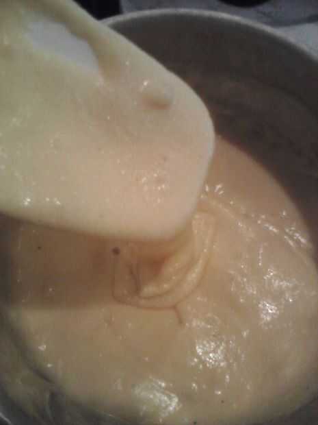 -Empezar a mezclar en media un puñado de queso a la vez. Espere hasta que se funde con el resto de la mezcla antes de agregar el próximo puñado. Seguir haciendo esto hasta que hayas todos 2 tazas.