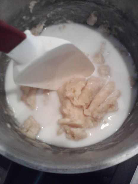 -Una vez todo mezclado uniformemente, vierta aproximadamente 1/4 de una taza de leche en la cacerola y revolver hasta que toda la mezcla es uniforme.