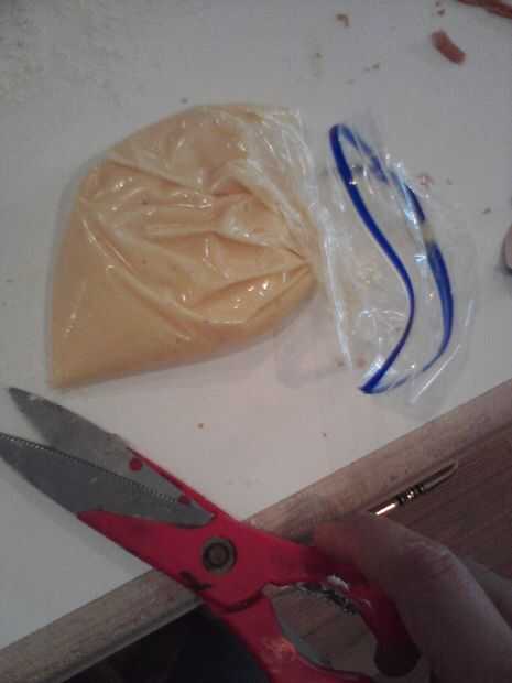 -Vierta la mezcla en la bolsa de plástico y cortar un pequeño agujero en la punta de la bolsa.