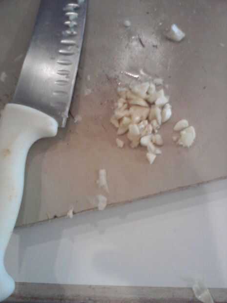 -Una vez es bonito y dorado, dados por los dientes de ajo y echar en la cacerola así (añadiendo que con la cebolla al mismo tiempo se queme el ajo... YUCK)