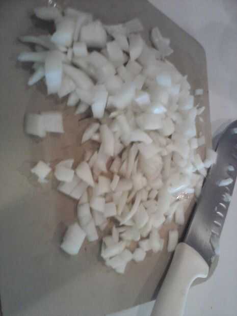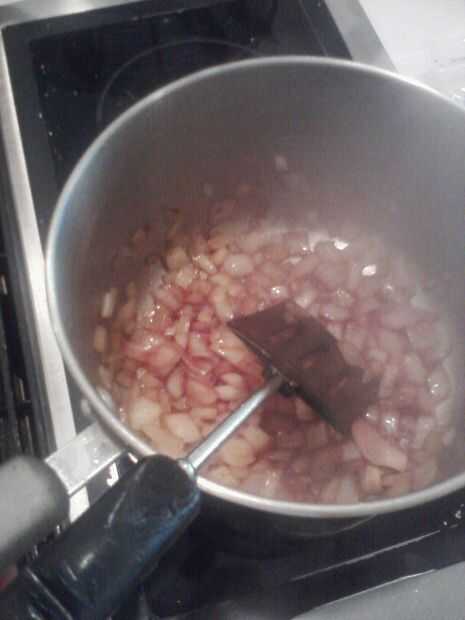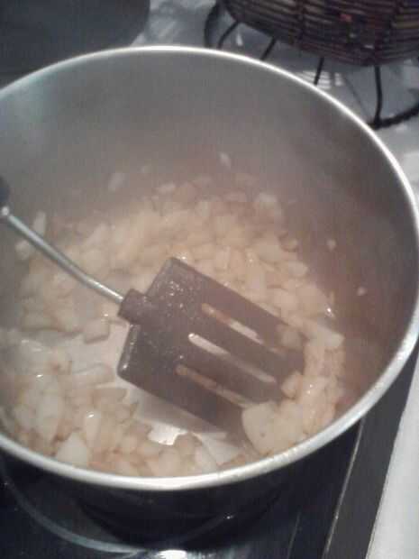 -Saltear la cebolla en la cacerola a fuego medio con aceite de oliva hasta que esté dorado (Asegúrese de limpiar el queso. Derramé mi queso extra en un frasco de salmuera para su uso posterior)
