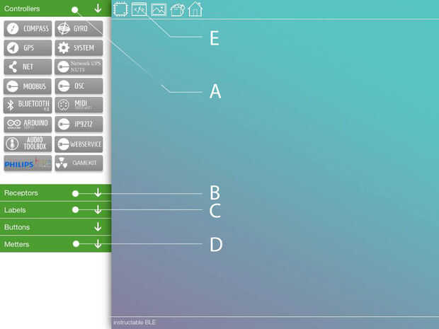 En Kino App Inventor que tiene una sección relacionada con la entrada (interna como el Gps o giroscopio de tu móvil) o vinculados a los recursos externos como el Bluetooth o Internet, es decir calles "Controladores" (A en la imagen).