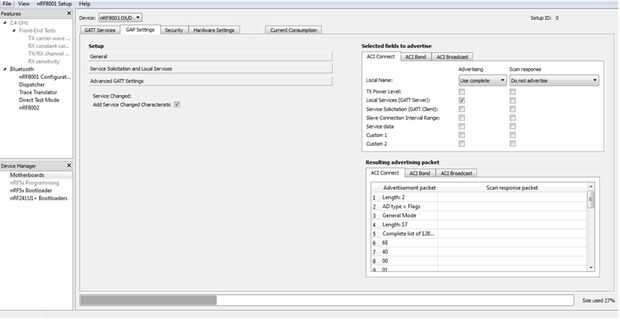 En la Configuración avanzada de la GATT, seleccionamos la Característica de cambiar de servicio añadir para permitir que el servidor (nRF8001) alertar al cliente (teléfono inteligente) de los cambios estructurales