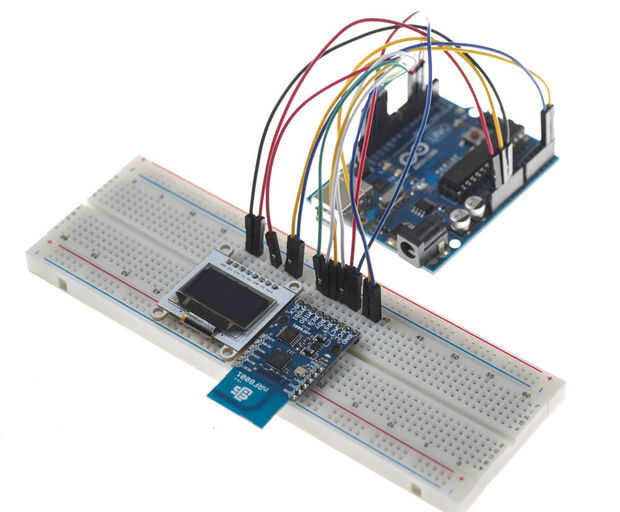 Las fotos de arriba muestran la instalación de cableado de la pantalla OLED y la Junta de desarrollo de nRF8001.