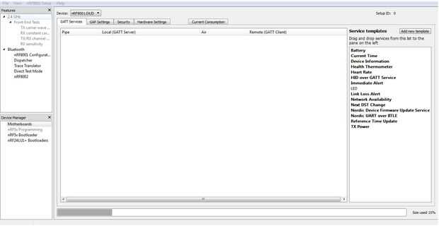 En esta ventana, vamos a establecer los servicios y características que queremos que el nRF8001 tener. A la derecha de la ventana podemos ver una lista de servicios que están disponibles. Para añadir el servicio a nuestra viruta, simplemente seleccione y arrastre los servicios que queremos y caer bajo Local (Servidor del GATT).