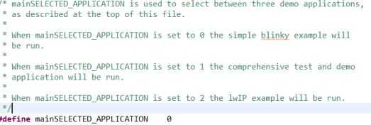 Descargar la última versión de FreeRTOS. En el SDK seleccione Archivo ⇒ Importar. ⇒ General de un área de trabajo existente, haga clic en y luego vaya a donde se descarga FreeRTOS. La demo se encuentra en FreeRTOS/Demo/CORTEX_A9_Zynq_ZC702. Tres proyectos se abrirá. Importaciones en el área de trabajo actual. Construirá los proyectos en el SDK. Carpetas azul contienen el código de los proyectos. Haga clic derecho sobre la carpeta y seleccione "Cambio referencia BSP." Cambiar el BSP a la que acaba de crear para su Zybo. Ir a main.c y encontrar el #define para mainSELECTED_APPLICATION. Esta a 0. Esto ajustará el programa para ejecutar main_blinky.c