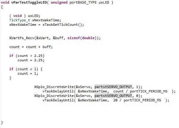 El método de vParTestToggleLed contiene la lógica que controla el controlador de servos. La hoja de datos del controlador de servo puede ser examinado para saber más sobre su funcionalidad. El método XUartPs_Recv recibe la información desde el módulo BLE. Luego utiliza este para emitir pulsos variables al controlador de servo. Esto ajustará la posición del servo y rastrear el movimiento del usuario.