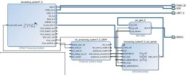Otra vez, haga clic en "Agregar IP" y buscar "gpio". Crear una instancia de GPIO y haga doble clic en el cuadro. Seleccione "Todas las salidas" y crear un ancho de 1. Aplicar esta configuración. A continuación, haga clic en "Ejecutar bloque automatización." Aparecen más bloques. Estos bloques más grandes administración el sistema AXI.