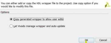 Finalmente, vaya a la ventana de fuentes y haga clic en design_1.bd. seleccionar la opción de contenedor crear un HDL. Seleccione "Copia generado envoltura para permitir ediciones de usuario".