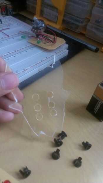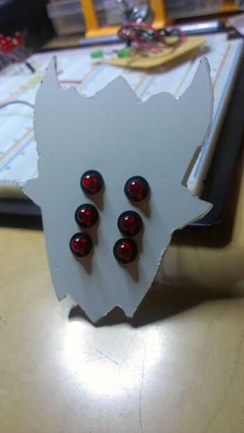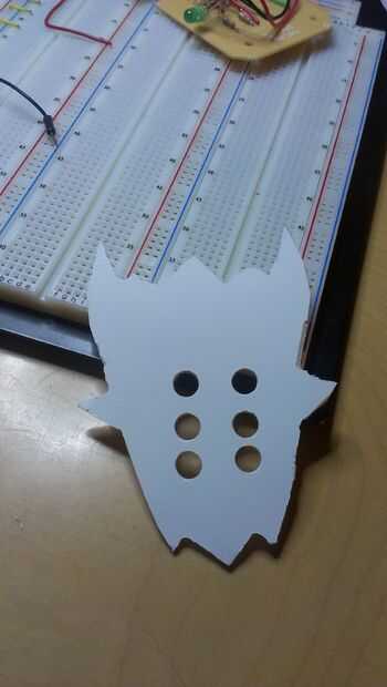 Mi placa frontal inspirado "Hueco" fue hecha de plexiglás que tenía por ahí de proyectos anteriores. Dibujé un diseño de cómo quería mi máscara para parecer, luego córtelo hacia fuera usando un rotozip. Procedí a taladrar los agujeros donde será el LED "ojos" y luego he pintado un lado blanco. Los anillos negros son las tomas de LED que vienen en realmente prácticos para un proyecto como este.