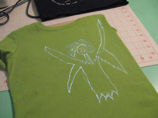 Solicité una línea bastante gruesa de gel blanqueador a cada marca de tiza mi hijo puso en su camiseta y lo mismo con el diseño de mi hija. Una vez que todo había sido cubierto con lejía salimos para fijar durante unos veinte minutos.