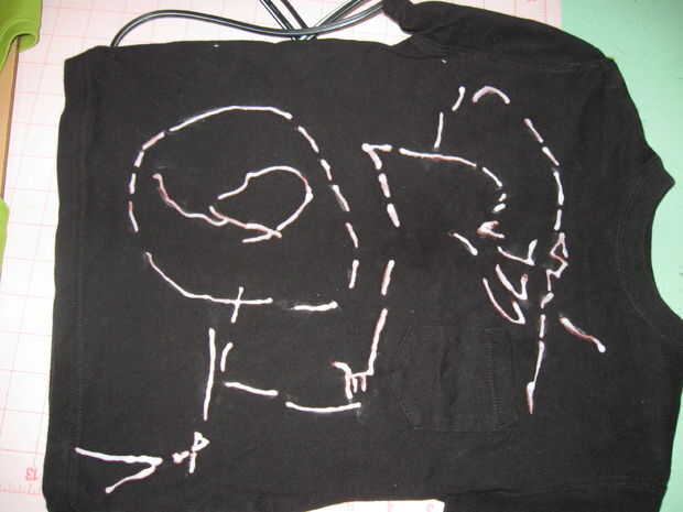 Dejamos el blanqueador reposar unos veinte minutos, pero se pueden dejar reposar por más o menos tiempo dependiendo del color el diseño que. Por ejemplo, con la camiseta verde, si nos habíamos lavado diez minutos antes de hadas de mi hija hubiera sido amarillo en lugar de blanco. Colores más oscuros toman blanqueador más ir a colores más claros, así que si quieres líneas blancas sobre una camisa negra que tenga que dejarlo reposar un tiempo l-o-n-g. Se puede saber si observas de cerca el diseño de la camisa negra que hay un matiz rojizo en los bordes de las líneas de cloro. Los niños estaban muy emocionados de ver su dibujo en arte permanente y aturdido por el cambio de color!