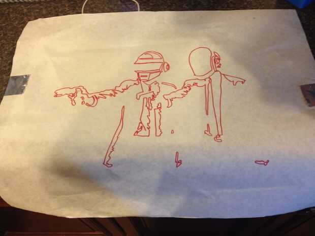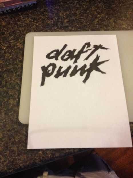 Fue impreso el logo daft punk, porque no necesita ser tan grande. La imagen principal, sin embargo, era mucho más grande. Para ello, corté papel en un rollo grande tuve (yo recomiendo conseguir un rollo de papel compañeros los aficionados al bricolaje. Gran inversión). Para obtener la imagen más grande que la pantalla de mi ordenador. Utilicé el navegador de internet en mi PS3 para obtener la imagen en mi tv. Entonces que remontar la imagen desde allí. Un gran por qué simple para trazar diseños más grande que el monitor del ordenador.