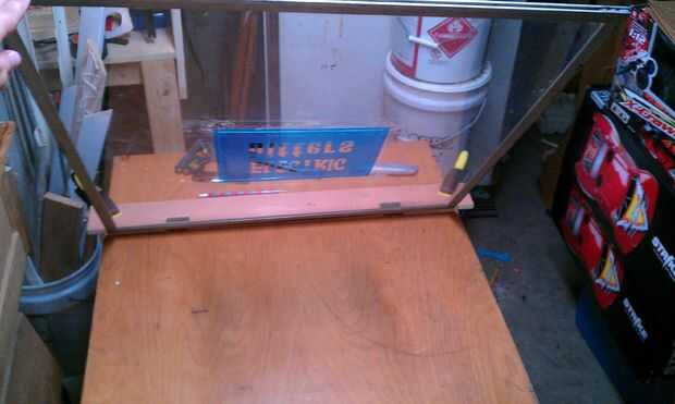 No voy a entrar en detalles sobre el montaje y abisagrar porque es muy improvisada y no crítico a hacer la camisa. Pasos rápidos y sucios: Encontrar un par de bisagras Alinear y montar bisagras para marco de ventana y tablero (muesca según sea necesario) Cuadrado y abrazadera de mesa a mesa.