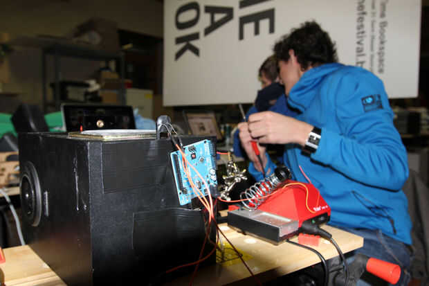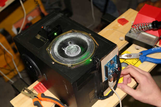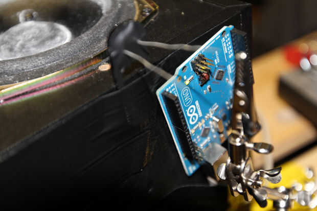 Montamos un verde del laser bajo sobre el cono del altavoz y en el otro lado una fotorresistencia (LDR).