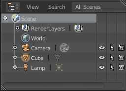Al lado de la vista 3d (a la derecha) usted encontrará muchas opciones y ajustes. Este enseño a usted como proceder. Por encima del ajuste y opciones (esquina superior derecha por encima de los símbolos) se verá algo como "capas de render", "mundo", etc.. Esto muestra lo que está dentro de su proyecto (objetos de malla, cámara, texto, lámpara, etc.).