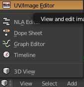 Verá un pequeño triángulo con líneas en la parte inferior izquierda de la pantalla por encima de la línea de tiempo. Si arrastra el triángulo obtendrá múltiples vistas en 3d. Cambiar la vista a editor de imagen UV. Haga clic en el enlace abierto en la parte inferior y selecciona la imagen de los archivos para cargar la imagen.