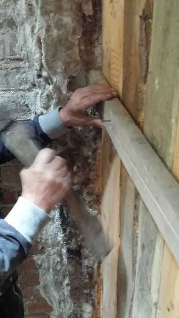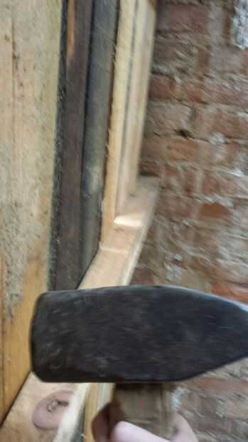 So first things first. Usted tiene que borrar el espacio para el escudo. El escudo se inscribe en una rebaba que ya están hechos. Entonces ram una 4 "x 4" entre pilares y uñas al escudo