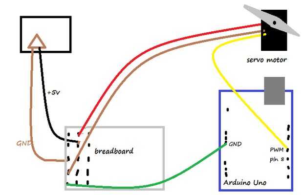 Servo motor tiene 3 cables: cable marrón conectar al pin GND. Cable amarillo con conector digital 4. Cable rojo al pin de 5V. Aquí, usted puede conectar el motor servo (adjuntar un pequeño ventilador para el motor) para Arduino Uno.
