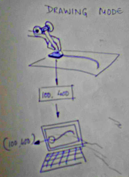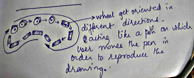 Como dibujar utilizando el dispositivo, la trayectoria recorrida por la punta de la pluma consigue registrada en el equipo. Colocar aquí el lana y el Velcro, permitiría sentir lo que has dibujado. Cuando sientas un dibujo que está en un equipo, utilice el lápiz con la punta de la rueda, la rueda rueda a lo largo de los contornos del dibujo de línea virtual mientras la empuja la pluma. Una vez hecho, se puede sentir el dibujo siguiendo el hilo de lana pegadas en el tablero de velcro.