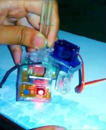 Cortar un trozo rectangular que sostiene el motor servo y pegar esta pieza al lápiz hueco con pegamento.