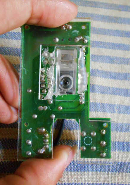 Ahora, allí debe ser un lente de plástico con un pequeño prisma, aplicarle pegamento y pegarlo a la Junta de ratón a la posición inicial.