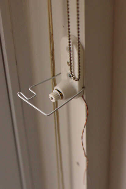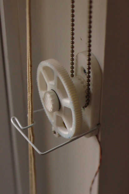H. doble un pedazo de un colgador de ropa como se muestra en la foto para hacer una guardia, para que se ajuste en las ranuras de L en la parte trasera de la abrazadera ancla. Mina también tiene un bolsillo pequeño doblado en el alambre para sujetar el otro cable que nunca utilizo, así que no atrapa en los engranajes.