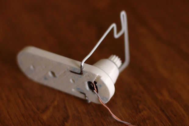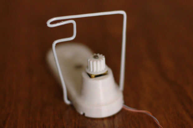 C. soldadura los cables el motor en la parte posterior del soporte. Hay no positivo o negativo, porque el motor funciona a ambas direcciones. Los hilos escurr a un lado a través de un canal en la parte posterior del soporte de anclaje.