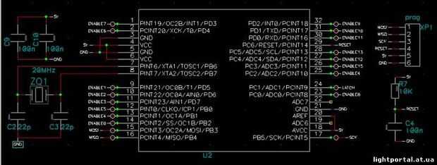 las láminas están diseñadas para ser esclavo o maestro, una sola viruta ATMega328P, están encadenados junto, cada segmento puede ser independiente pero sólo necesita a un amo.