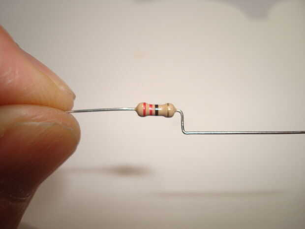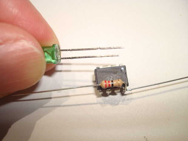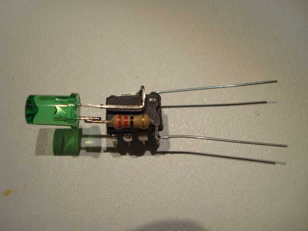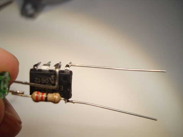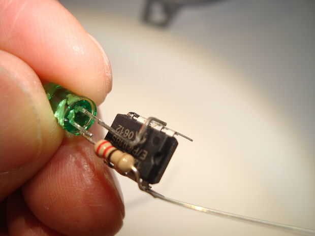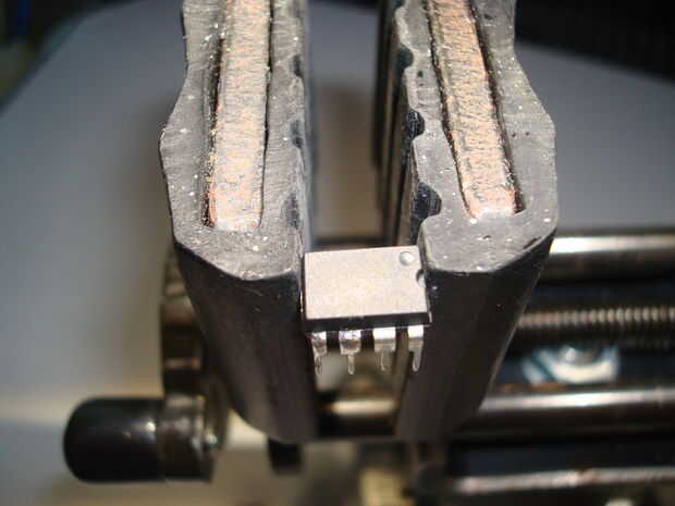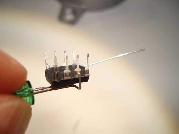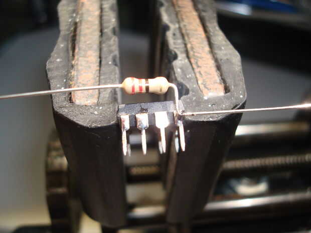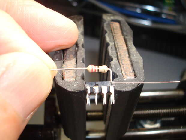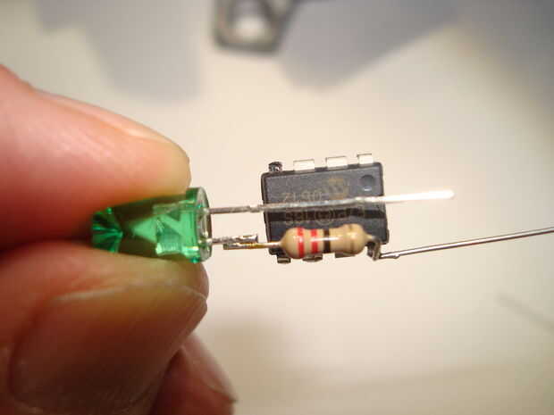 Sigue las imágenes para montar su BlinkLED. Utilicé un soldador pequeño y un tornillo de banco para mantener el PIC. Tenga en cuenta la orientación de la muesca al realizar la primera soldadura conjunta. Se suelda la resistencia al pin 8 del PIC. Guardar el alambre sólido de la resistencia y el soldar para el PIC en el ultimo paso. Su acabado BlinkLED dos tendrá libre de cables para conectar (más [+] a la clavija 1 [Vdd] y menos [-] 8 [Vss], el perno con la resistencia del perno).