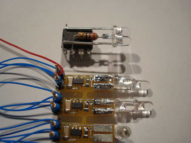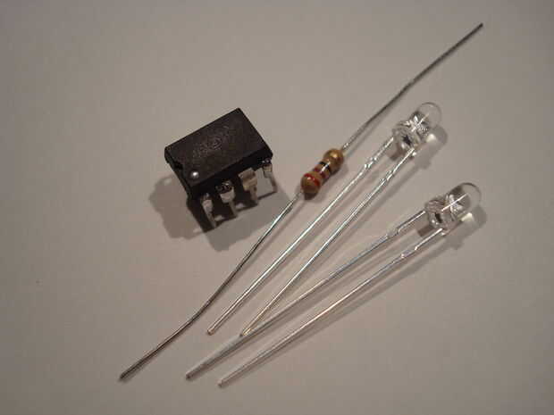 Porque los dos LED están conectados eléctricamente a través de la fuente de energía, ellos ambos iluminará simultáneamente si el voltaje es demasiado alto. La tensión de corriente depende de los LEDs que uso. Si esto ocurre, utilice una tensión de alimentación inferior. Para mi BlinkLEDs una tensión de entre 3.2 y 4.5 voltios funcionó muy bien.