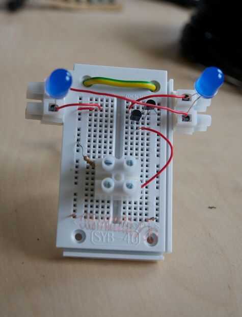 Excepto los leds azules, todas las piezas vinieron del "paquete de aprendizaje" en Conrad. Si no estás familiarizado con la electrónica, le recomiendo que compre un kit como el que tengo. Todo lo que necesitas está allí, incluso un lay-out del circuito!